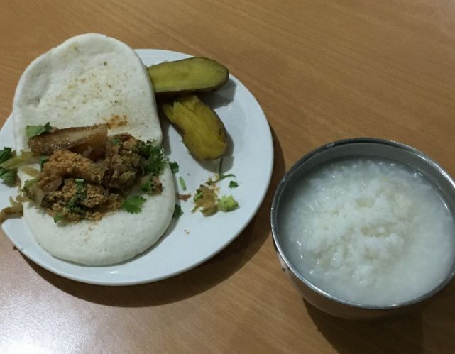 - 早餐: 通常是清粥(或鹹粥)配罐頭麵筋、土豆麵筋、醬瓜、肉鬆、饅頭、簡單炒高麗菜或豆棗之類。同樣是熱食熱粥為主,目的是讓你有足夠能量應付凌晨的攻頂行程。簡單但有效。記得早餐時間很早(配合攻頂出發),別睡過頭!